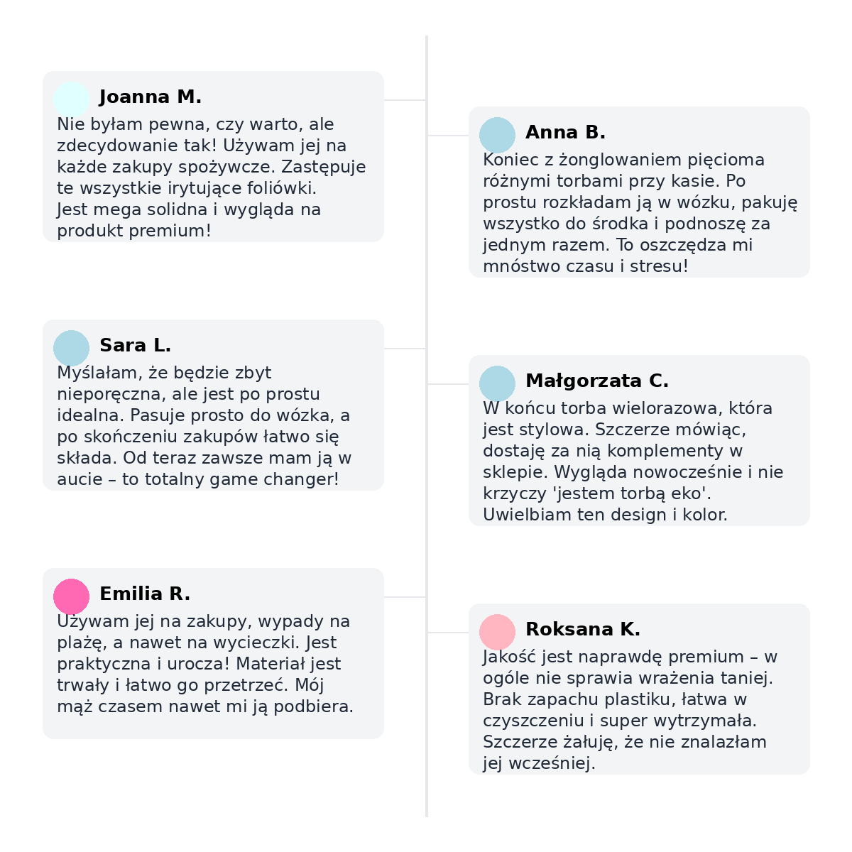 Podwójne, szerokie paski równomiernie rozkładają ciężar. Nawet pełne zakupy nie ciągną ani nie zahaczają.